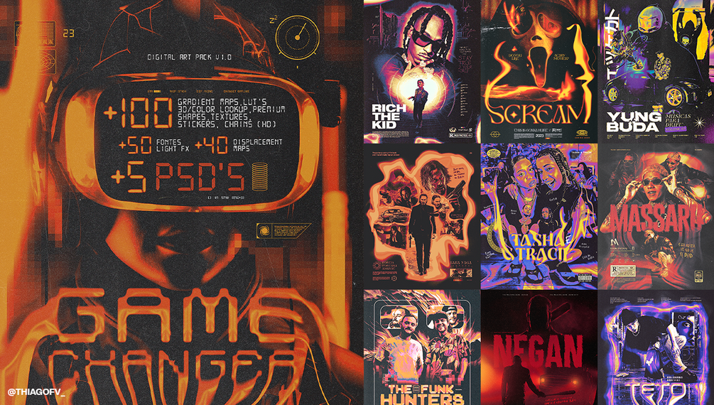 This pack was developed 100% in favor of the art style I make (Brutalism/Mishko Effects/Futurist/Vintage), ALL the materials I usually use in my arts I am making available in it, from textures, brushes, models, fonts and the infamous gradient maps that have the power to transform any art.