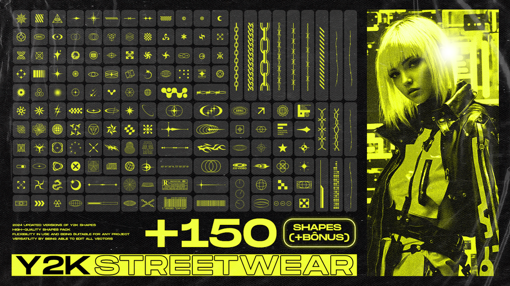 Get into the nostalgic vibe of the 2000s with this exclusive pack of Y2K and streetwear elements. Perfect for adding both a futuristic and retro touch, the pack features a bold combination of icons inspired by urban culture. Ideal for creating brutalist art, prints, album covers, posters, and much more.